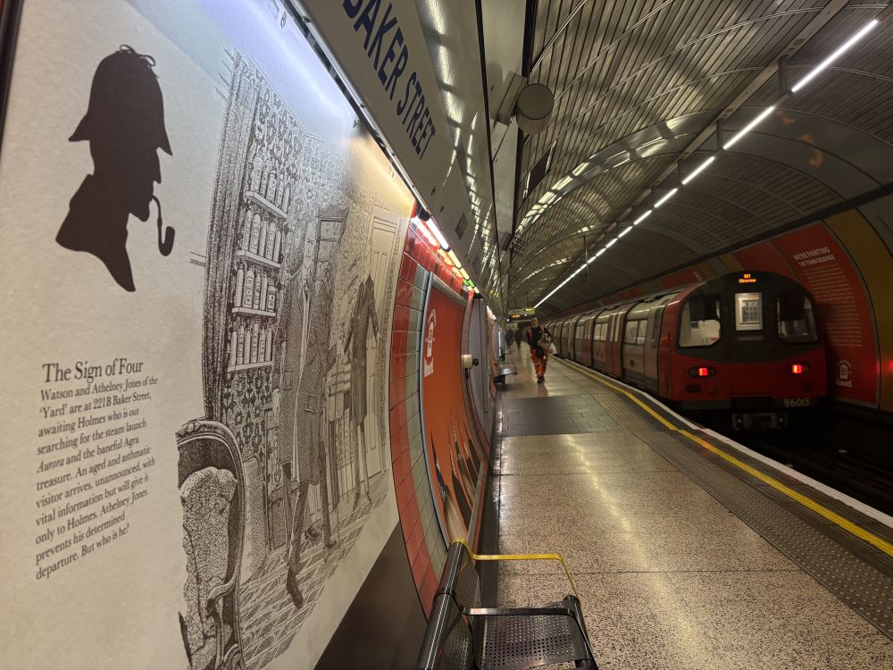 伦敦最古老的地铁站之一贝克大街地铁站,墙面上有福尔摩斯图画。