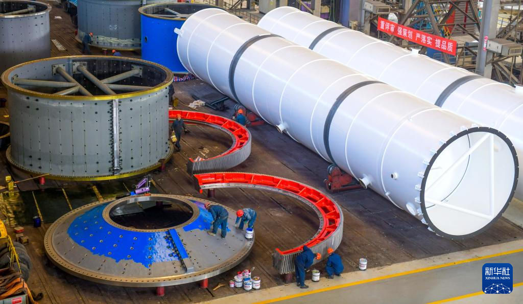 2月24日,在江苏省连云港经济技术开发区重山风电设备公司车间,工人在生产风电塔架。