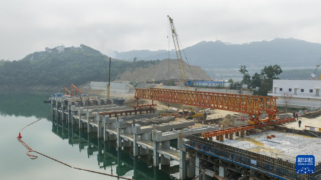 2月24日,工人在珠江航运云南富宁港建设工程码头预制纵梁架设现场作业(无人机照片)。
