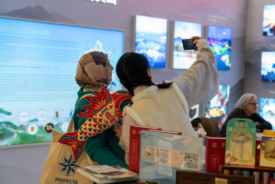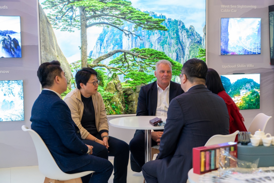 与此同时,展台上的品茶区也打造出一个“打卡点”。来自黄山的祁门红茶,以其独特的“祁门香”俘获了各国友人的味蕾,大家在茶香中品味来自东方的温暖与雅致。而展台上的图片和视频不仅展示了黄山奇绝的松石云海,徽州菜式的经典佳肴,还有隐匿山巅的高端美宿“雲亼·狮林崖舍”——这座融合了徽州人文意蕴与当代设计美学的山居,正吸引着越来越多追求深度体验的境外旅行者。