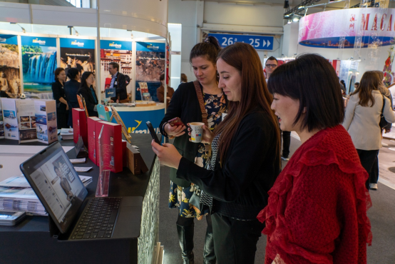 与此同时,工作人员拿着手机和平板电脑等,不时向观众介绍黄山旅游开发的人工智能导览助手,更是令许多来宾赞叹不已。借助这个“小助手”,外国游客也可以轻松了解各个景区的实时资讯,轻松规划游览路线、获得景区导航、预定酒店餐厅、了解景点详情并享受即时讲解服务等。传统文化与现代科技在展台上的邂逅,让许多观众纷纷掏出手机扫码黄山各类资讯媒体的二维码,秒变“忠粉”。