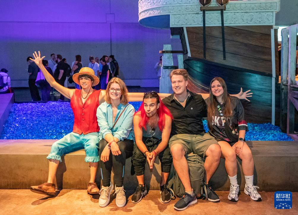 8月20日,在德国科隆,人们在2025年科隆国际游戏展上与模型合影。