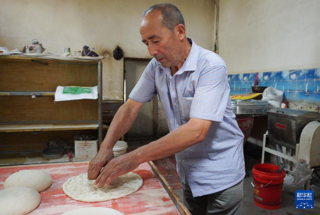 7月21日,在新疆库车市,热西提在自家馕店中制作馕坯。