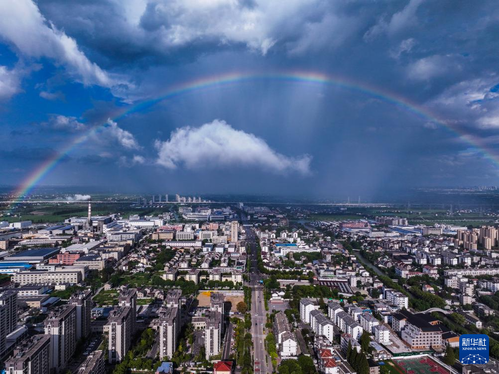 这是9月19日在沈荡镇拍摄的雨后彩虹(无人机照片)。