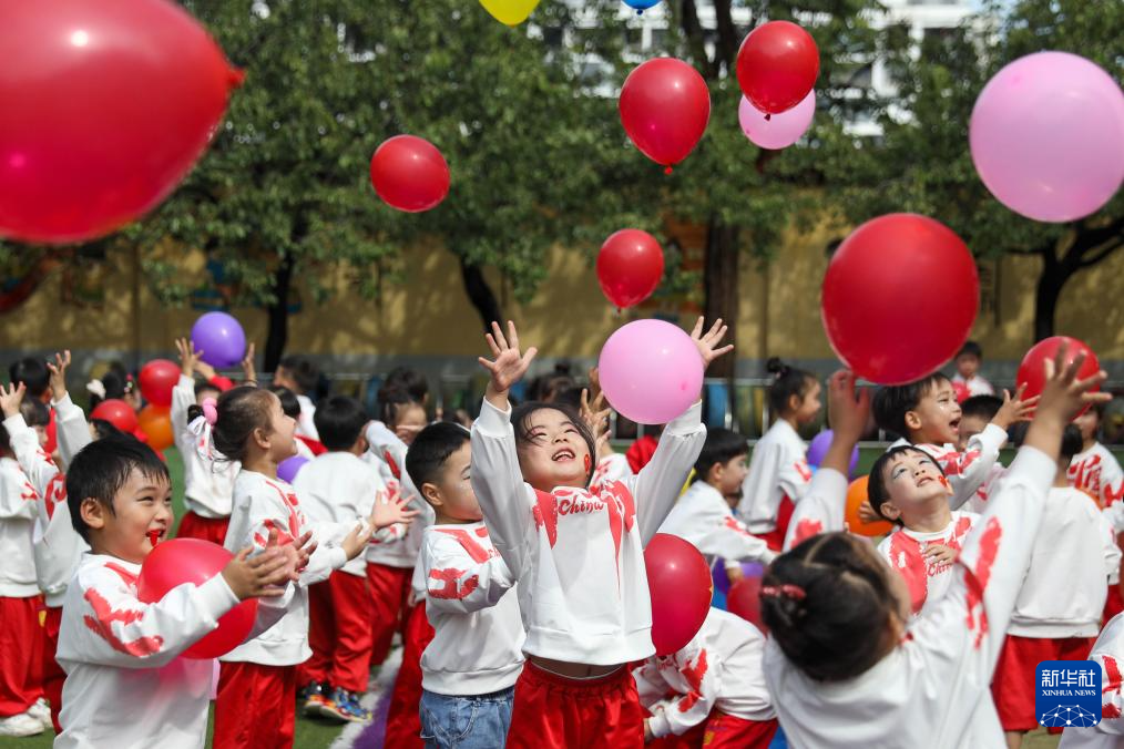 9月29日,河南省平顶山市宝丰县闹店镇中心幼儿园的孩子们在放飞气球。