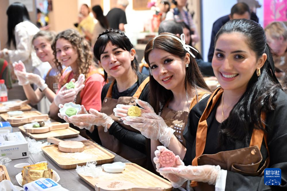 9月29日,在北京市朝阳区于小菓点心模具博物馆,中外青年展示自己制作的月饼。