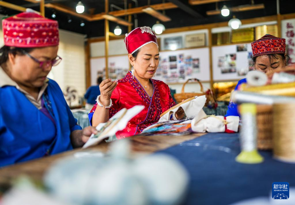 龙禄颖(中)在位于贵州省施秉县的舞水云台非遗工坊进行刺绣创作(10月10日摄)。