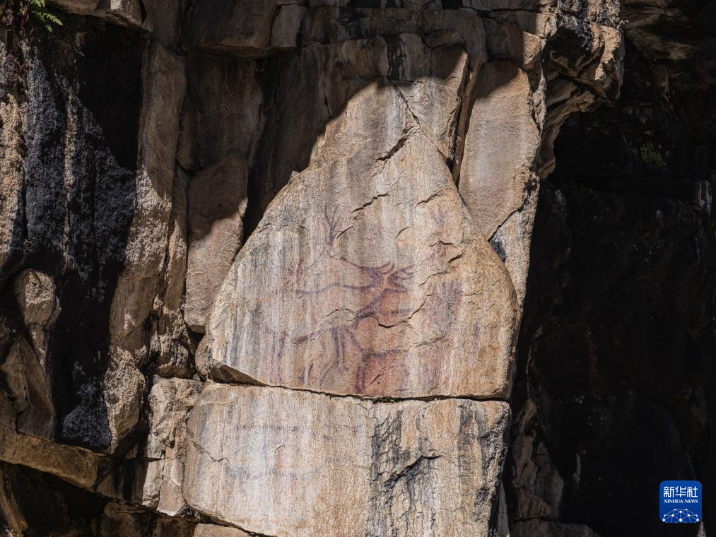10月21日拍摄的久乃岩画。该岩画由红颜料涂绘的十余幅鹿形图像和若干抽象图案组成。