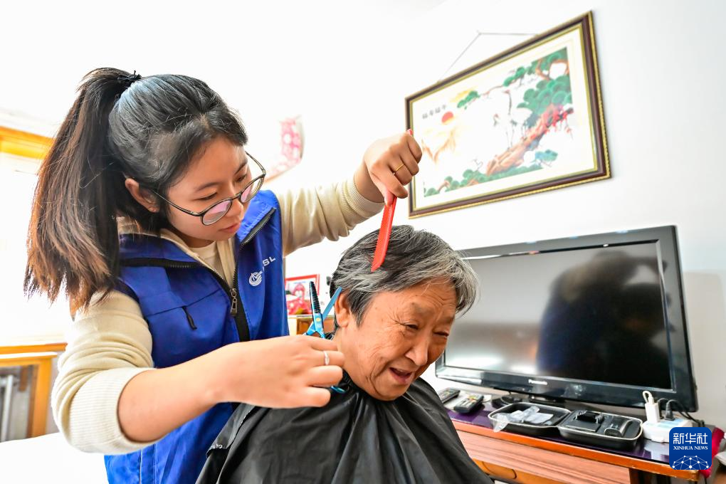 10月27日,志愿者在天津市滨海新区新河街道珠江里社区为老人理发。