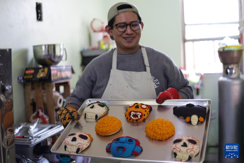 10月27日,在墨西哥首都墨西哥城的一家面包房,面包师展示“亡灵面包”。