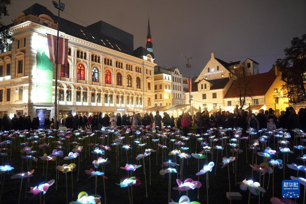 11月17日,民众在拉脱维亚首都里加举行的灯光节上欣赏老城利乌广场的灯光艺术装置。
