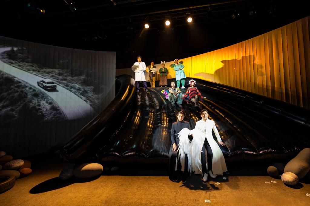 舞台上到处是散落的石块、歪掉的路牌,俨然是一场车祸现场,而占据视野的是高达3米的充气滑梯。导演林丛说,在这样巨型装置的笼罩下,台上发生的一切更增添了一份“纯属虚构”的抽象感和象征意味。