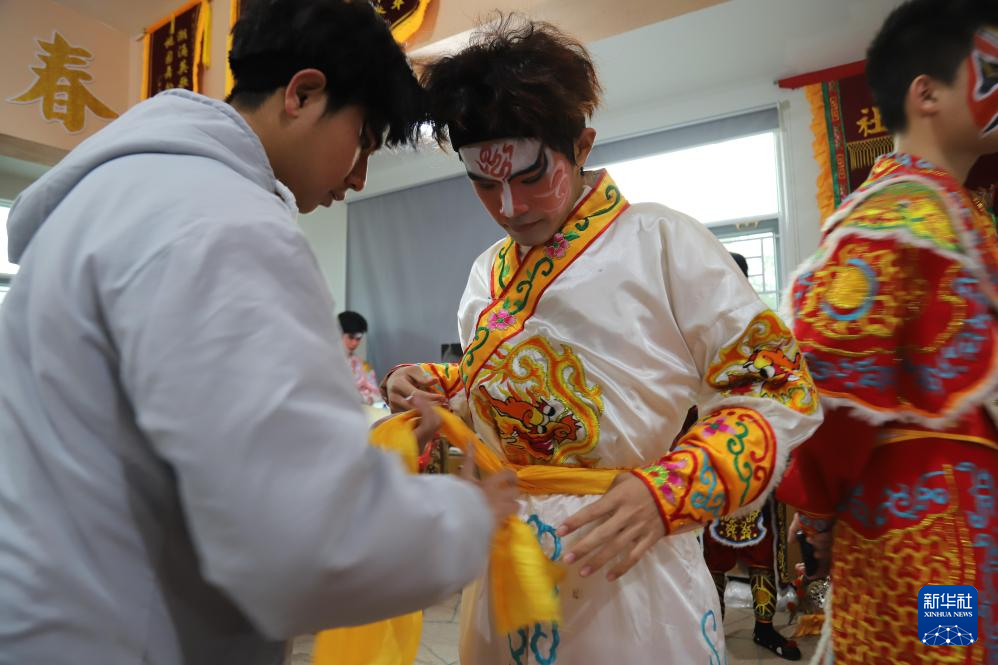 2025年1月29日,农历正月初一,在汕头潮阳区文光桃园英歌训练基地,英歌队员忙着化妆。