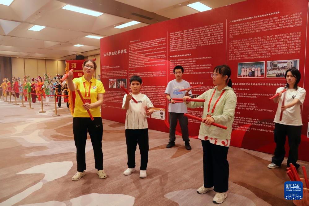 2025年10月3日,在汕头国际会展中心英歌舞非遗展示区,传承人(左)指导观众学习英歌舞步。