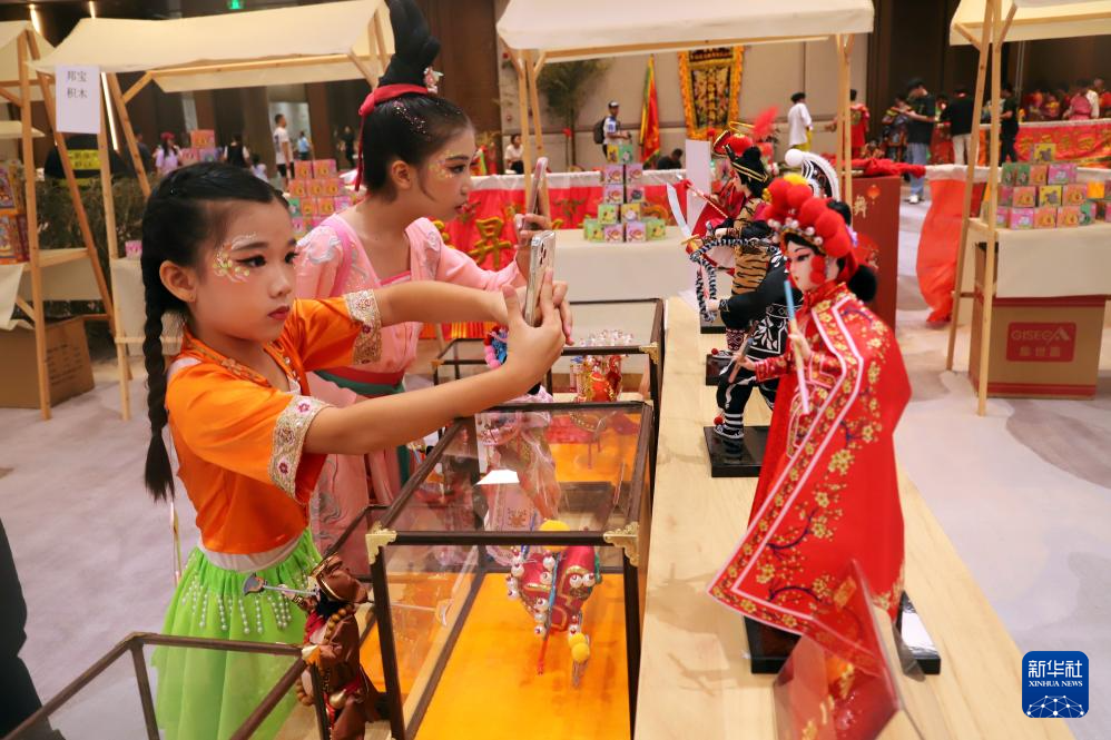 2025年10月3日,在汕头国际会展中心英歌舞非遗展示区,观众拍摄英歌舞主题潮绣挂件、泥塑摆件等工艺品。