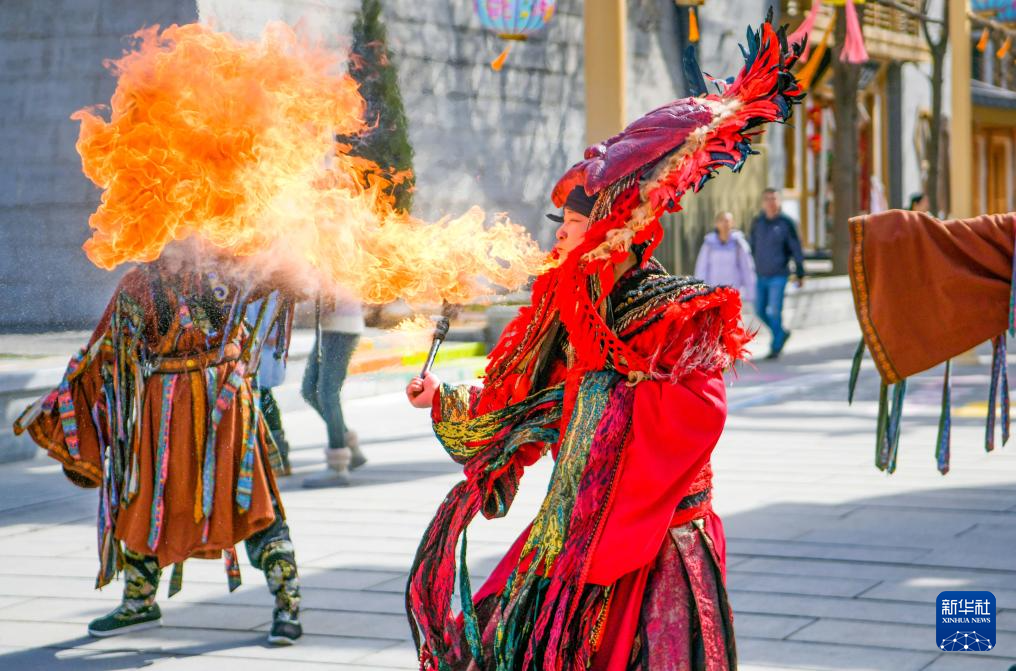 2月10日,在河南省洛阳市龙门古街,演员为游客进行吐火表演。