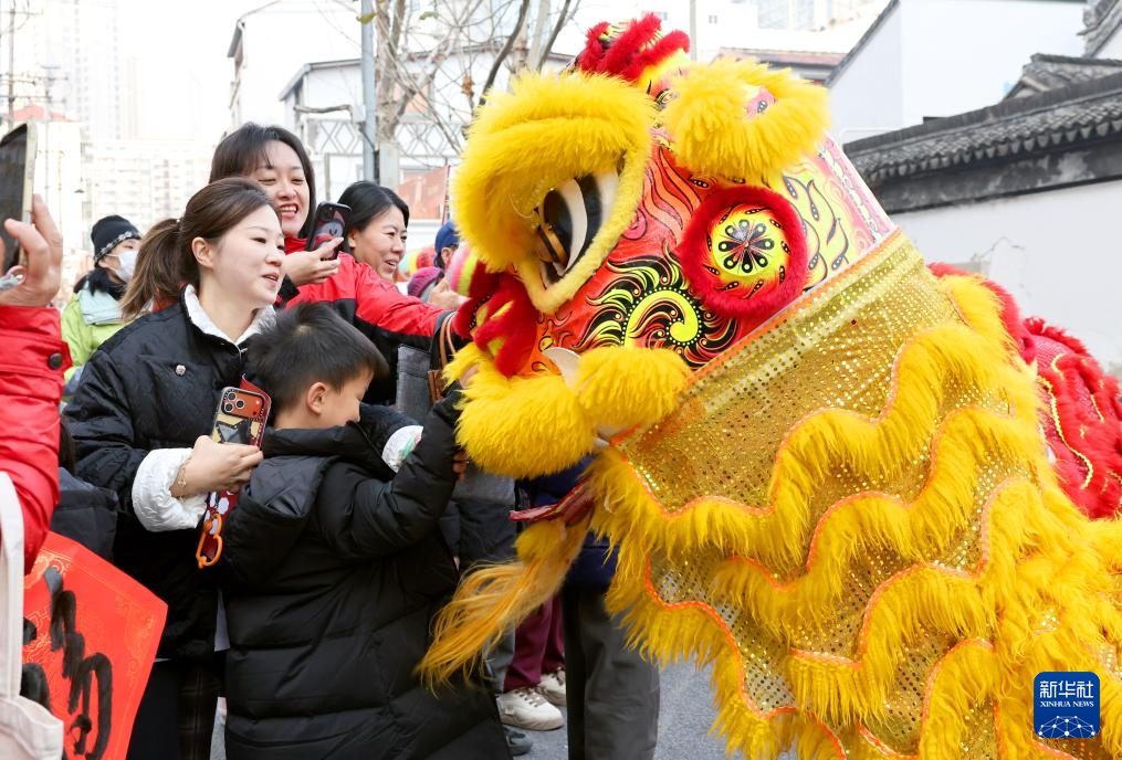 2月12日,游客在春联大会上与舞狮互动。