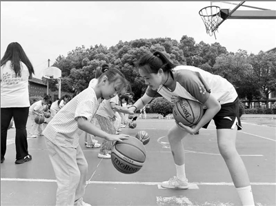 安徽师范大学“阳光体育”爱心夏令营实践团成员(右一)教小学生打篮球。朱海兵 摄
