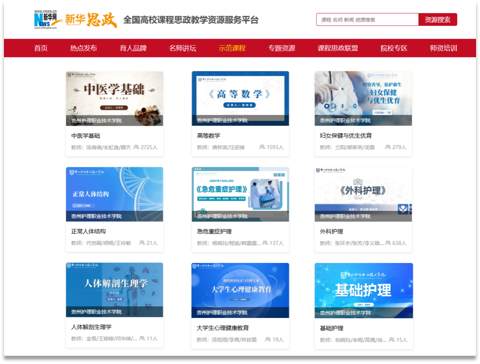 近日,贵州护理职业技术学院《急危重症护理》《正常人体结构》《妇女保健与优生优育》《人体解剖生理学》《外科护理》《基础护理》《高等数学》《中医学基础》《大学生心理健康教育》等9门课程思政示范课程上线新华网“新华思政”平台。