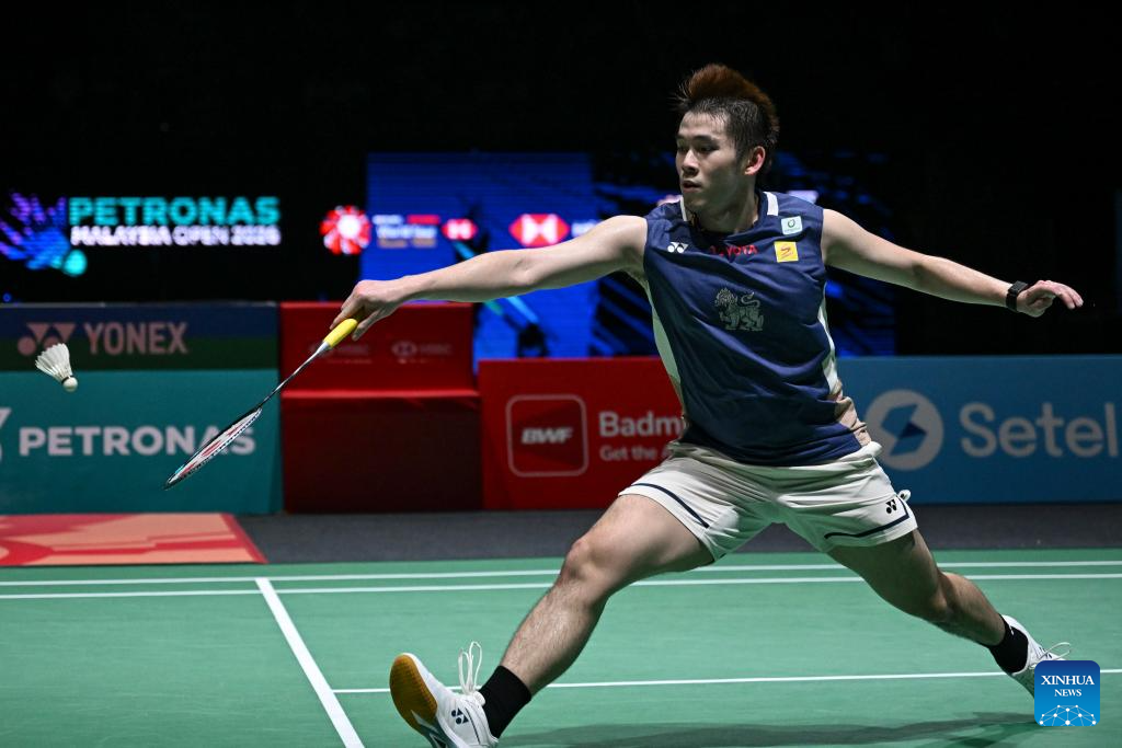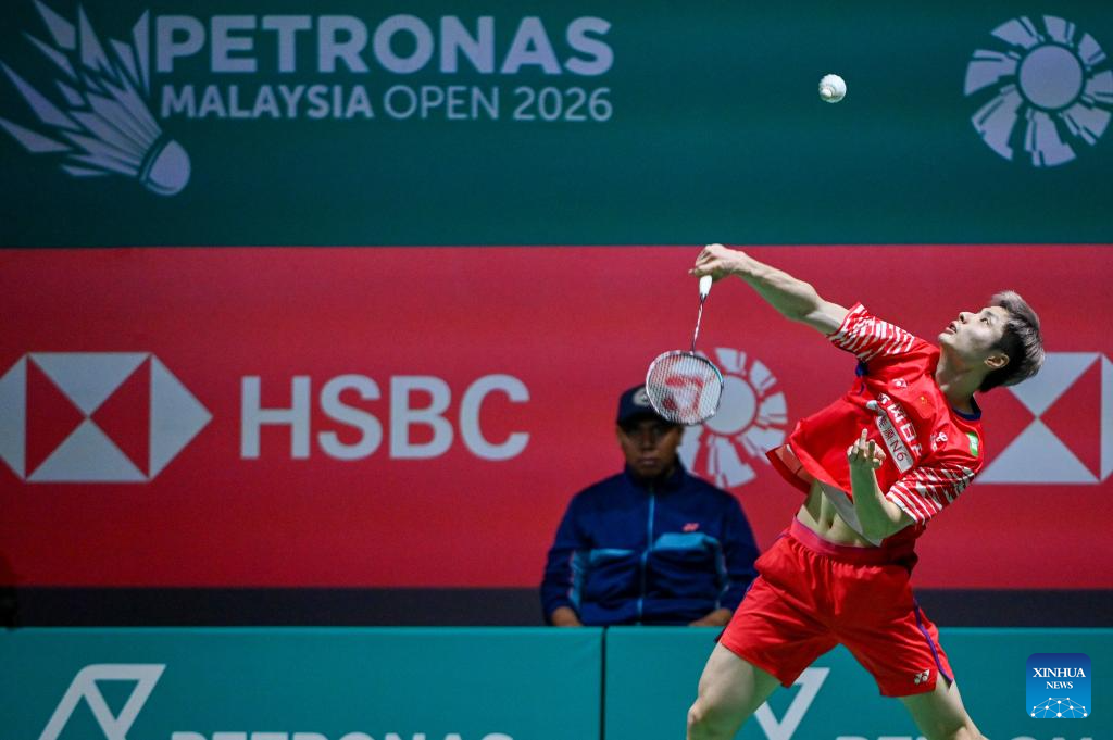 Shi Yuqi of China hits a return during the men's singles final match against Kunlavut Vitidsarn of Thailand at the Malaysia Open 2026 badminton tournament in Kuala Lumpur, Malaysia, Jan. 11, 2026. (Photo by Chong Voon Chung/Xinhua)