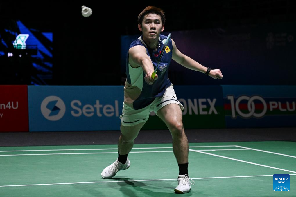 Kunlavut Vitidsarn of Thailand hits a return during the men's singles final match against Shi Yuqi of China at the Malaysia Open 2026 badminton tournament in Kuala Lumpur, Malaysia, Jan. 11, 2026. (Xinhua/Cheng Yiheng)