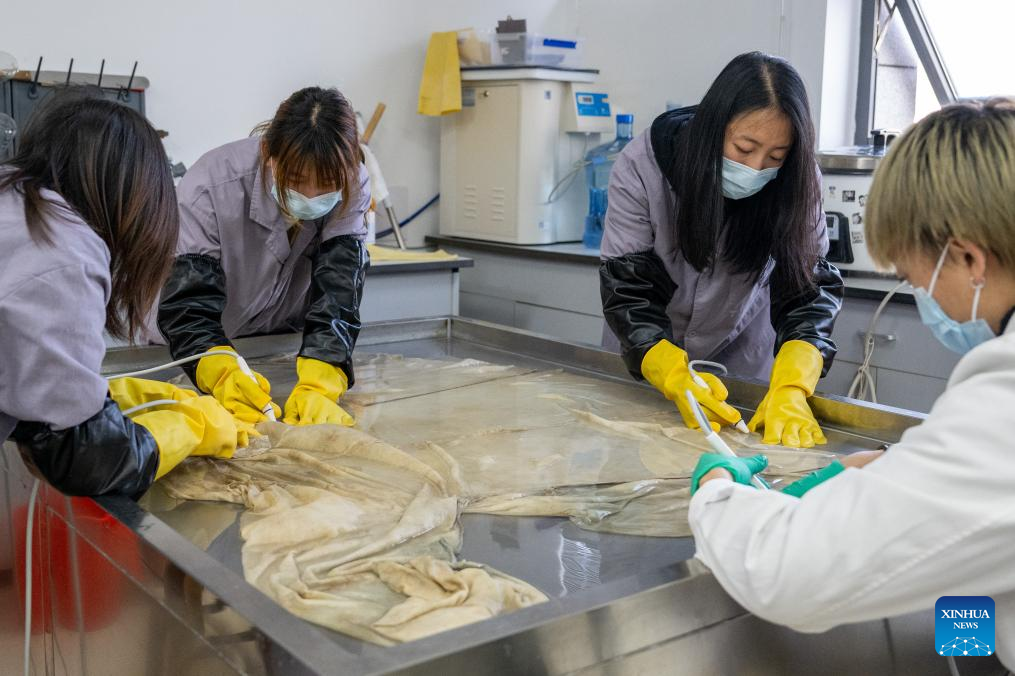 Staff members clean an ancient cotton garment at the cultural relics protection center in Jingzhou, central China's Hubei Province, Jan. 9, 2026. Organic cultural relics represented by bamboo slips pose significant challenges in cultural relic preservation. In recent years, the cultural relics protection center in Jingzhou of Hubei Province has focused on innovation and application of preservation techniques for organic cultural relics, striving to ensure comprehensive care for such items. (Xinhua/Du Zixuan)
