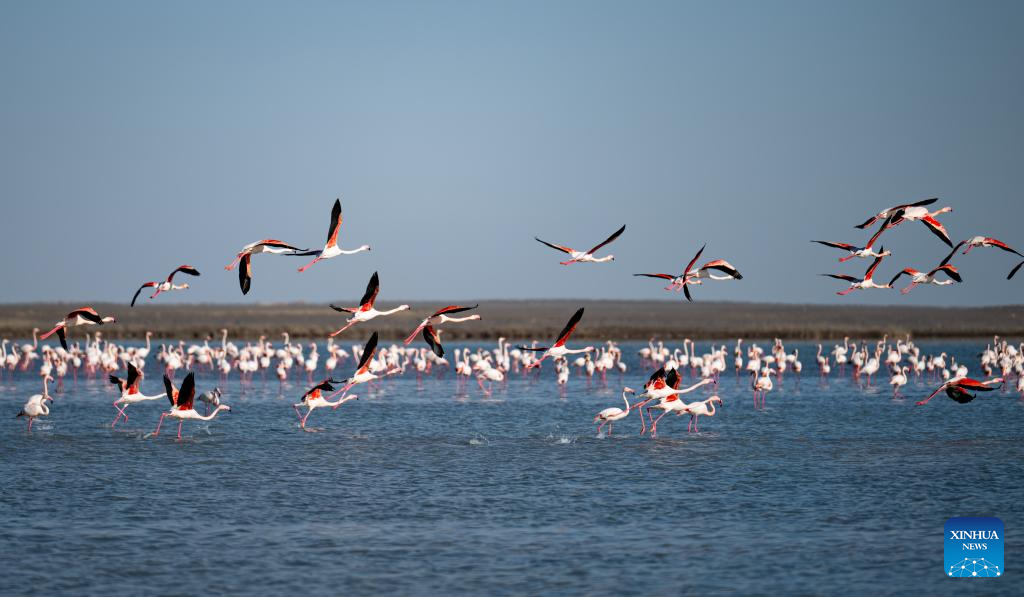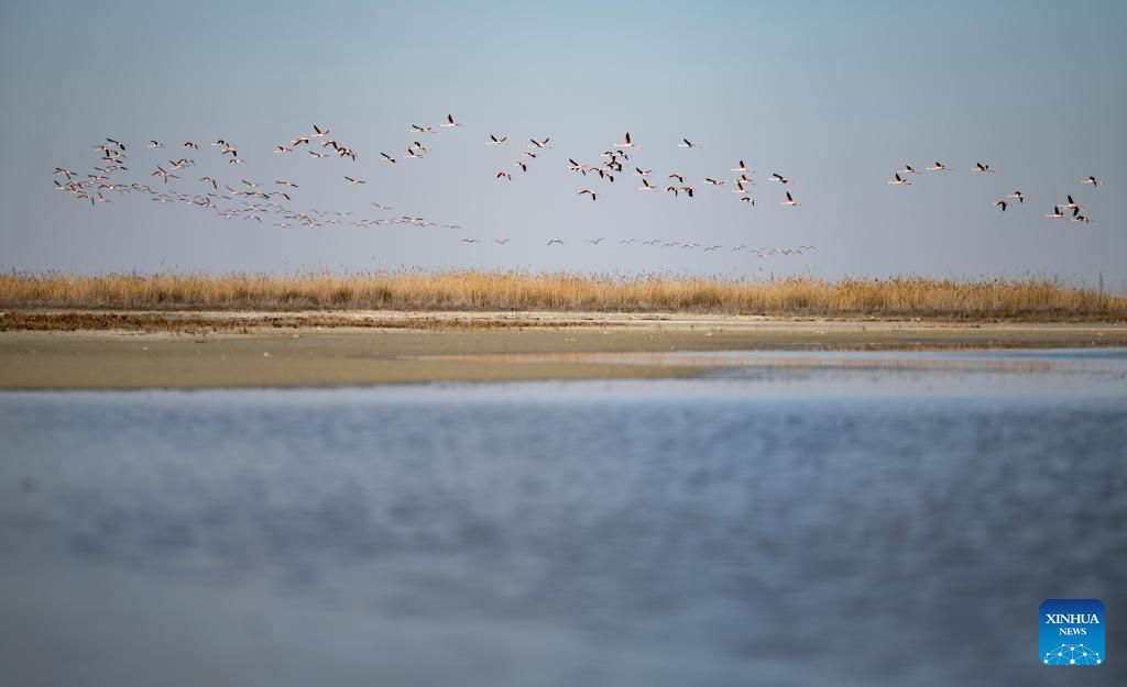 Flamingos fly over Karakol Lake on the outskirts of Aktau, Kazakhstan, on March 10, 2026. A flock of flamingos have settled on the Karakol Lake in the suburbs of Aktau, southwest Kazakhstan's Mangystau Region, before continuing on their spring migration. (Xinhua/Li Renzi)