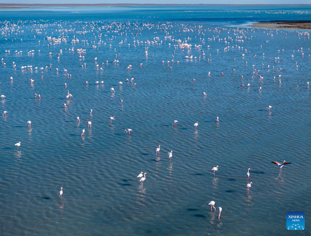 This aerial drone photo taken on March 10, 2026 shows flamingos at Karakol Lake on the outskirts of Aktau, Kazakhstan. A flock of flamingos have settled on the Karakol Lake in the suburbs of Aktau, southwest Kazakhstan's Mangystau Region, before continuing on their spring migration. (Xinhua/Li Renzi)