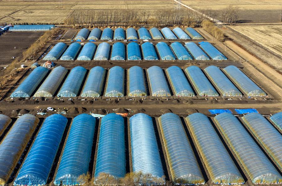 A drone photo taken on March 17, 2026 shows farmers preparing for seedling cultivation at Youyi Farm Co., Ltd. under Beidahuang Group in northeast China's Heilongjiang Province. (Photo by Xu Hongyu/Xinhua)