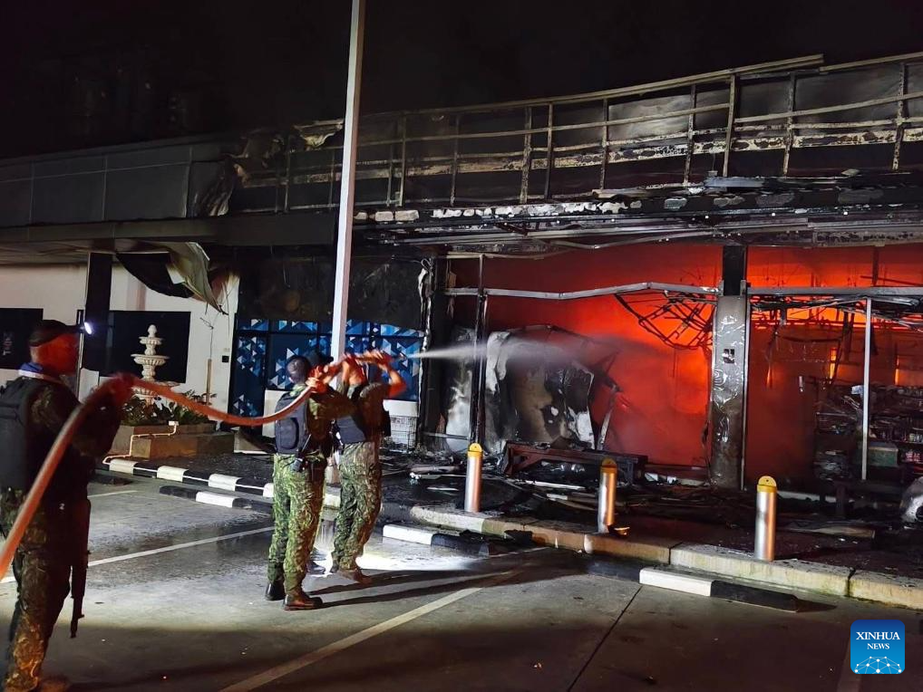 This photo released by the Royal Thai Armed Forces on Jan. 11, 2026 shows rescuers extinguishing a fire at a petrol station in Narathiwat, Thailand. Multiple petrol stations in Thailand's southern border provinces were hit by arson attacks and explosions late Saturday night, leaving one police officer injured, Thai military sources said on Sunday. (Royal Thai Armed Forces/Handout via Xinhua)