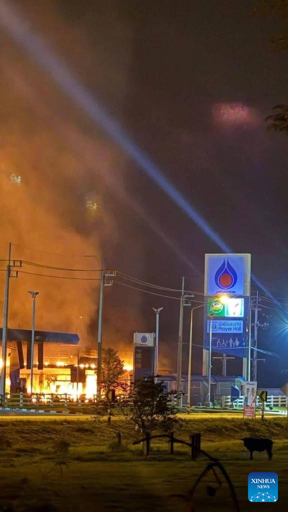 This photo released by the Royal Thai Armed Forces on Jan. 11, 2026 shows a petrol station on fire in Narathiwat, Thailand. Multiple petrol stations in Thailand's southern border provinces were hit by arson attacks and explosions late Saturday night, leaving one police officer injured, Thai military sources said on Sunday. (Royal Thai Armed Forces/Handout via Xinhua)