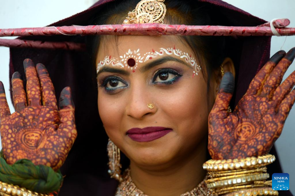 A bride poses for a photo during a mass wedding ceremony in Karachi, Pakistan, Jan. 11, 2026. (Str/Xinhua)
