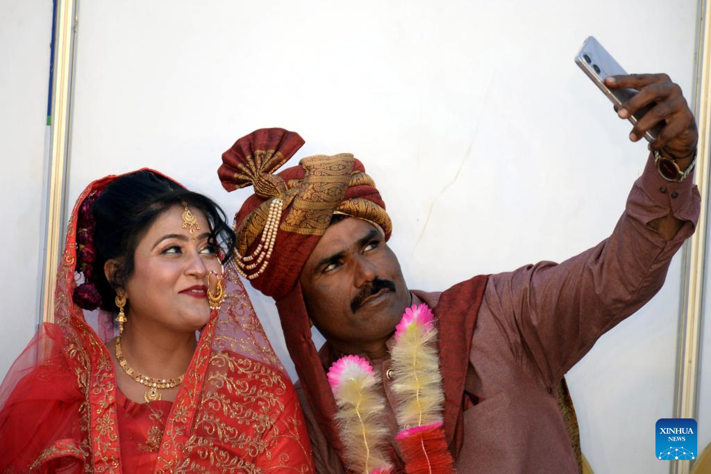 A bride and a groom take a selfie during a mass wedding ceremony in Karachi, Pakistan, Jan. 11, 2026. (Str/Xinhua)