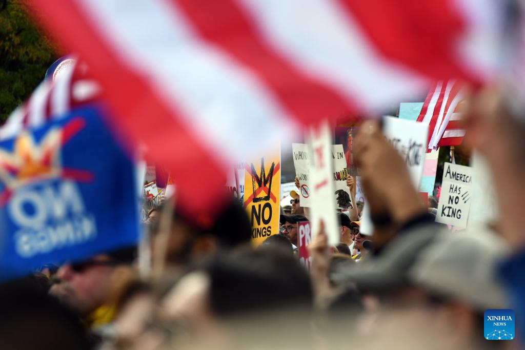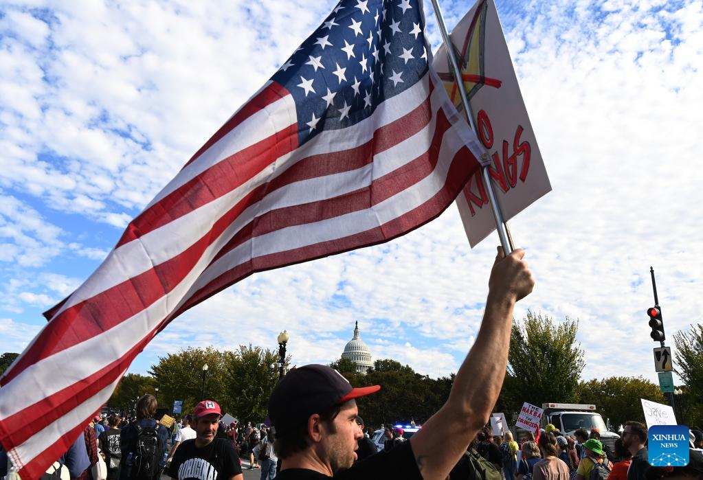 Following the first nationwide "No Kings" protest on June 14, this round of rallies, spanning all 50 states, came as the federal government shutdown entered its 18th day with no resolution in sight. (Xinhua/Zhang Fengguo)