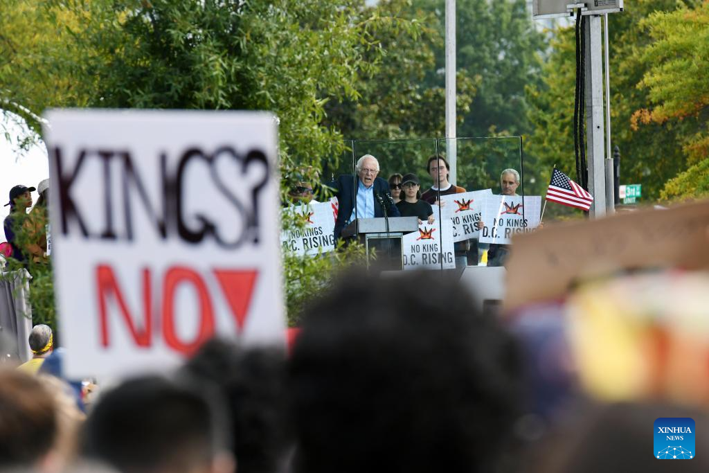 U.S. Senator Bernie Sanders (C) addresses a "No Kings" protest in Washington, D.C., the United States, on Oct. 18, 2025. Tens of thousands of people took to the streets across 2,700 U.S. cities and towns on Saturday for the second round of the nationwide "No Kings" protests, the largest single-day demonstration in American history.