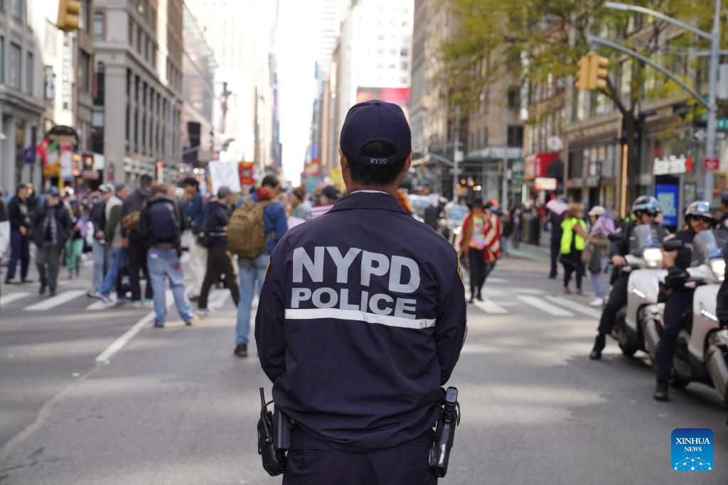 A police officer stands guard during a "No Kings" protest in Manhattan, New York, the United States, on Oct. 18, 2025. Tens of thousands of people took to the streets across 2,700 U.S. cities and towns on Saturday for the second round of the nationwide "No Kings" protests, the largest single-day demonstration in American history.