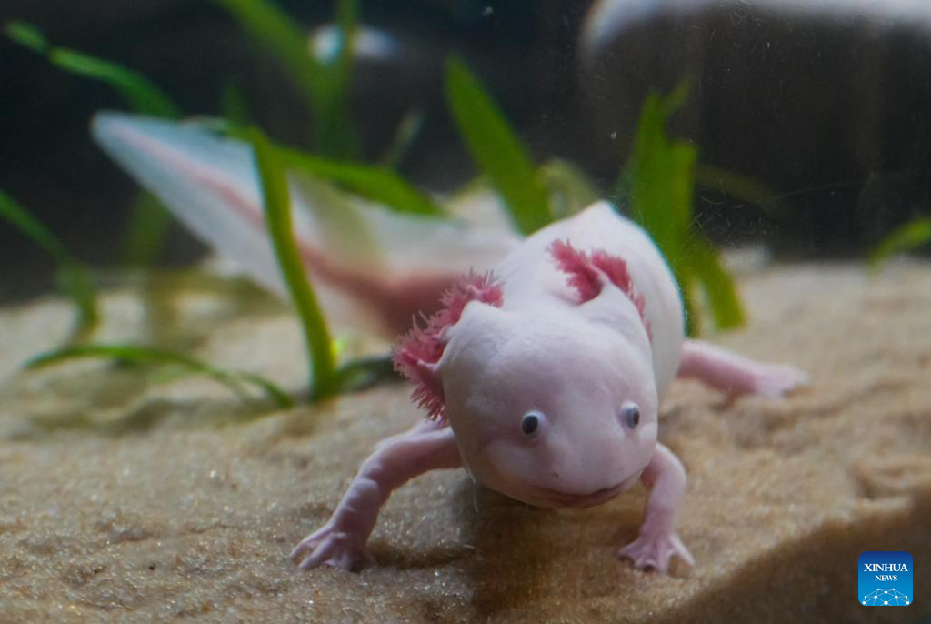 An axolotls is pictured inside an aquarium during the "Amazing Axolotls" exhibition at the Vancouver Aquarium in Vancouver, British Columbia, Canada, Jan. 11, 2026. The new permanent exhibit at the Vancouver Aquarium opened on Sunday features multiple habitats and interactive displays highlighting the unique biology and regenerative abilities of axolotls, an endangered amphibian native to Mexico. (Photo by Liang Sen/Xinhua)