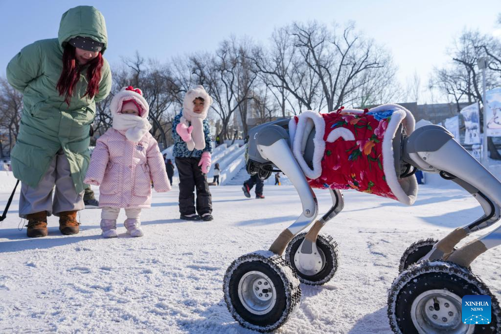 People view a robotic dog on the frozen surface of the Songhua River in Harbin, northeast China's Heilongjiang Province, Jan. 11, 2026. The surface of the Harbin section of Songhua River, now solidly frozen, serves as a "fun field," where locals and tourists alike enjoy themselves with ice-and-snow-themed amusements. (Xinhua/Wang Jianwei)