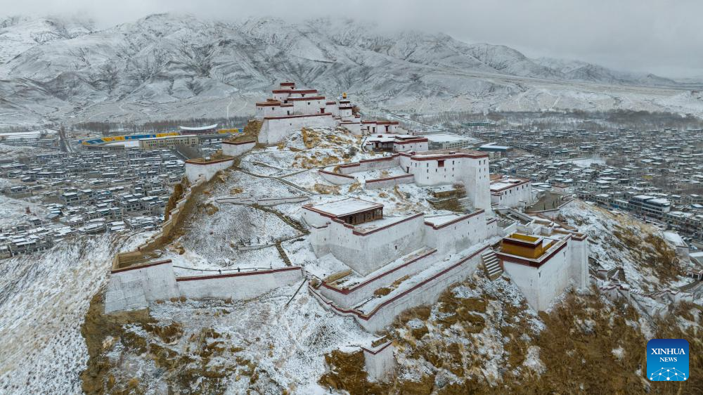 This aerial photo taken on March 13, 2026 shows the snow scenery of ancient white castles on Mt. Dzongri in Gyantse, Xigaze City, southwest China's Xizang Autonomous Region. (Xinhua/Jigme Dorje)