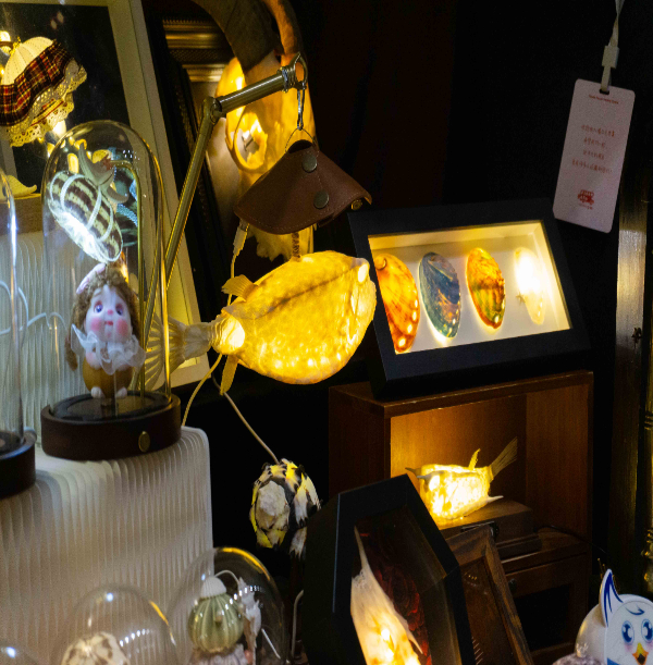 中医摊位是身体的疗愈场,而“深海星光售卖处”则是“心灵的慰藉所”。该摊位的两位主理人分工明确:一人将深海打捞的生物制成标本,另一人负责设计成灯具、冰箱贴等物件。“这盏‘爱神维纳斯的梳子’骨螺灯,源于女神用骨螺棘刺作梳的传说。”摊主阿龚向客人讲述着商品背后的故事,“灯光明灭间,仿佛诉说着山海与神明的私语。”她坦言,自己因热爱深海生物而投身创作,“它们本身就很治愈,希望能给忙碌的人带来短暂的温柔”。这份初衷,恰好契合了当下消费者对情绪价值的核心诉求。