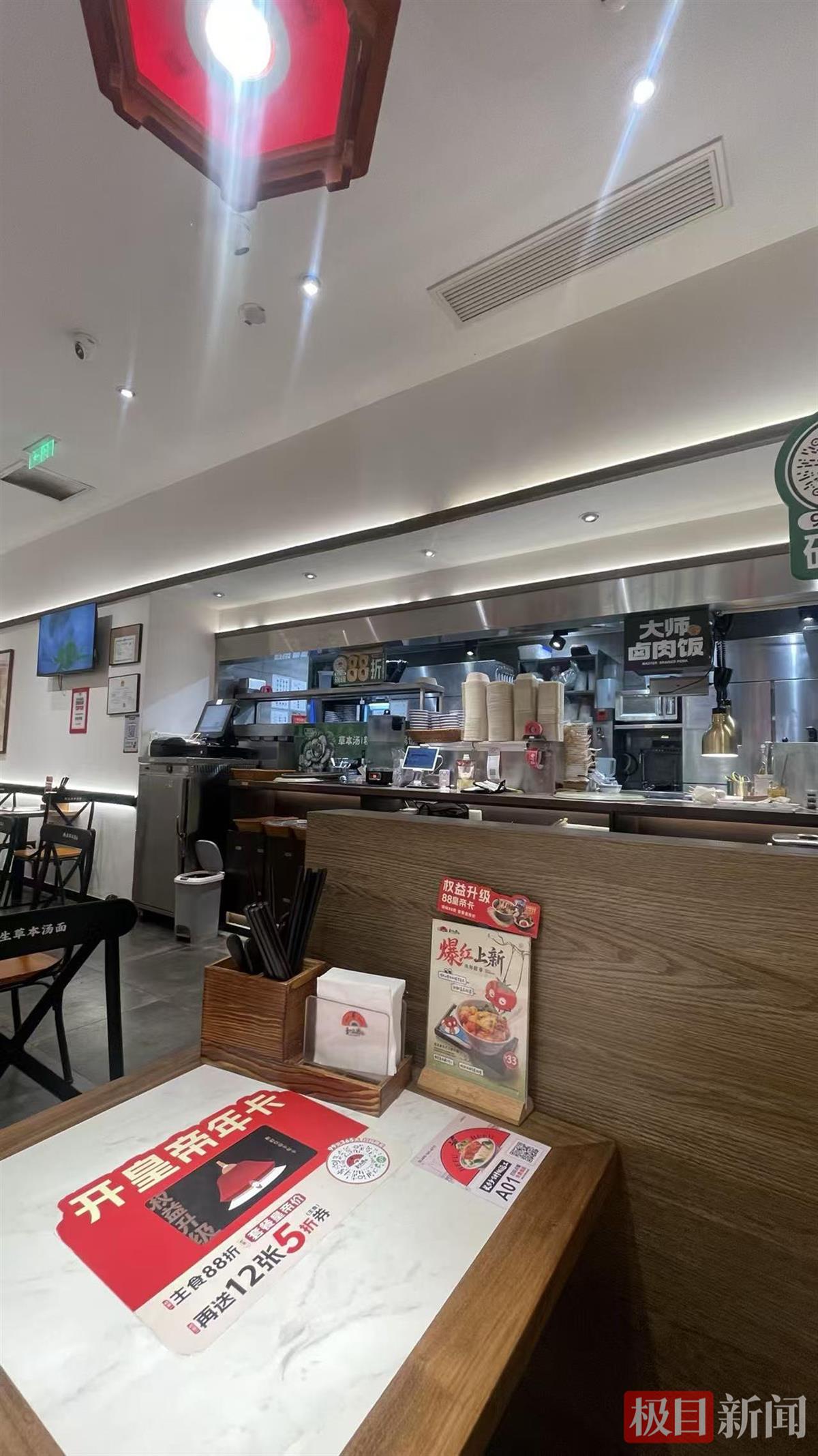 2024年年中,和府捞面创始人李学林曾在一次公开讲话中表示“我们始终以做奶粉的态度去做食品”,公司将实现自有中央厨房的透明化,以此回应消费者对预制菜的疑虑,并进一步提升品牌信誉。记者发现,销品茂的和府捞面门店的厨房区域用磨砂玻璃阻挡,珞喻路的门店厨房区域的操作区则被杂物阻挡视线,无法看清内厨操作。