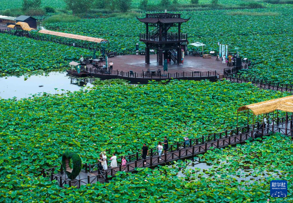 游客在江苏省兴化市万亩荷塘景区赏荷游玩(无人机照片)。