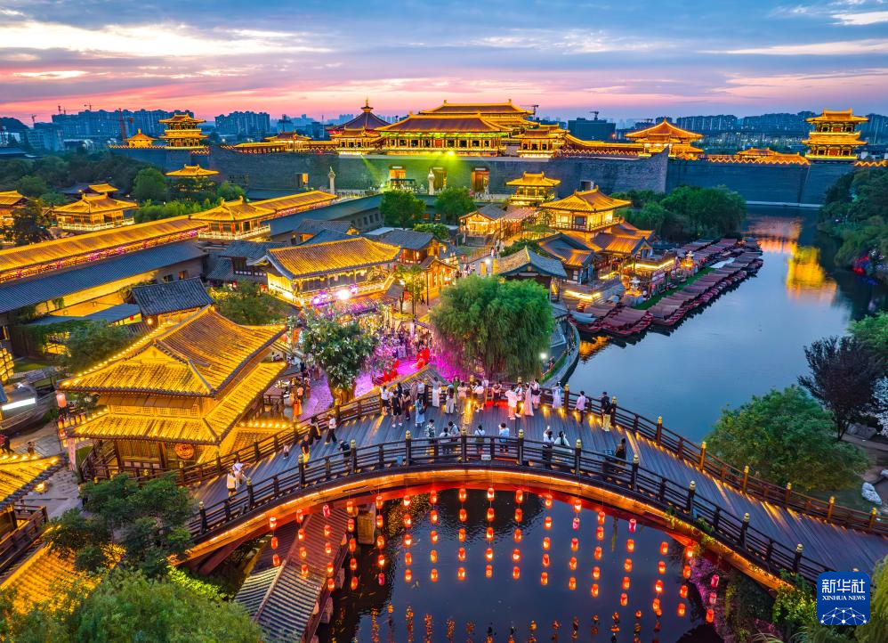 湖北省襄阳市唐城景区夜景璀璨,吸引游客前来游玩(无人机照片)。
