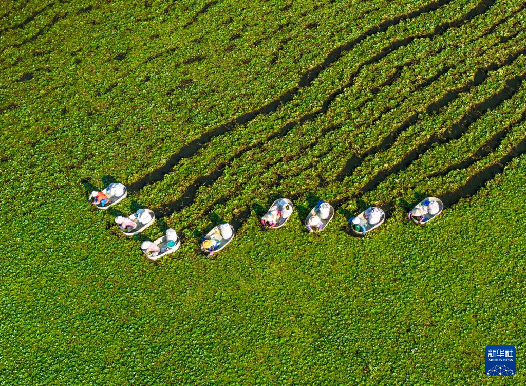 9月10日,村民在江苏省泰州市海陵区苏陈镇张家院社区采摘菱角(无人机照片)。