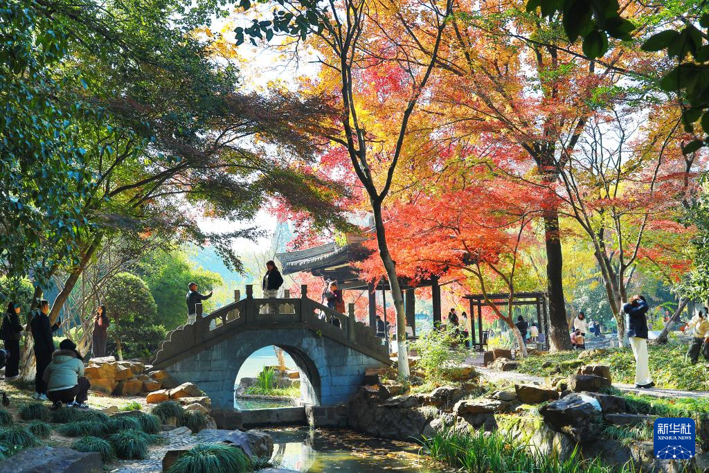 12月7日,市民在浙江义乌骆宾王公园游玩拍照。