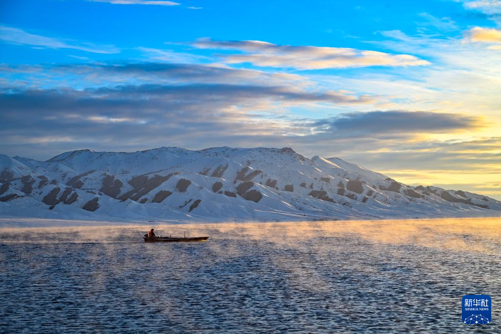 一条小船在赛里木湖中驶过(12月16日摄)。