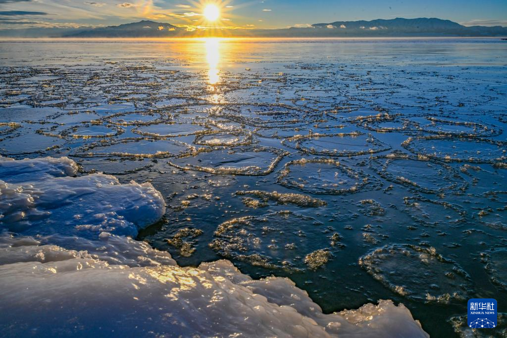这是12月23日在赛里木湖湖边拍摄的“冰馕”(无人机照片)。