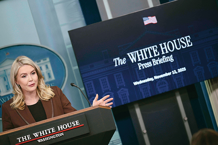 2025年11月12日,在美国华盛顿白宫,白宫新闻秘书卡罗琳·莱维特在记者会上发言 新华社/法新