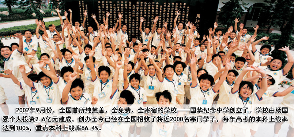 在楊國華去世10多年以后,楊國強(qiáng)計劃,以大哥的名字成立一所學(xué)校,一所只招收中國最貧困、最優(yōu)秀學(xué)生的全日制慈善高中——國華紀(jì)念中學(xué),以此來紀(jì)念英年早逝的大哥。