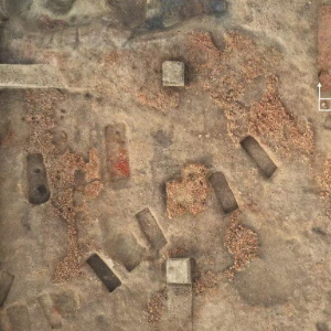 M122内棺南北疑似头箱、脚箱遗迹。(江苏省文物考古研究院供图)
